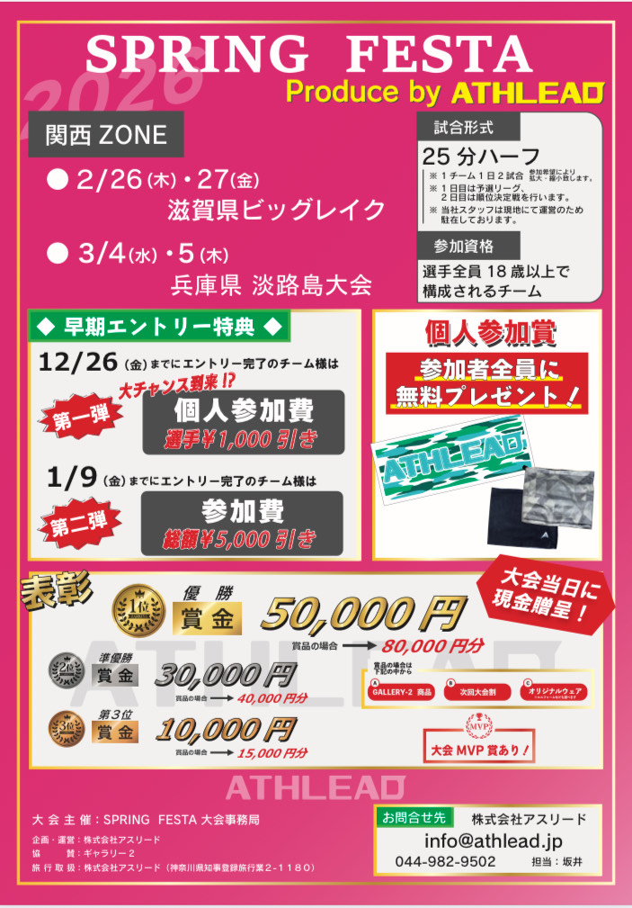 2025.12.16 【サッカー】【SPRING FESTA 2026】滋賀県ビッグレイク/兵庫県淡路島大会情報をアップしました! 2026年一発目の大会!!最初の王者はどこのチームだ!! 【2026年 2・3月 サッカー大会詳細 滋賀県ビッグレイク/兵庫県淡路島大会】はこちら